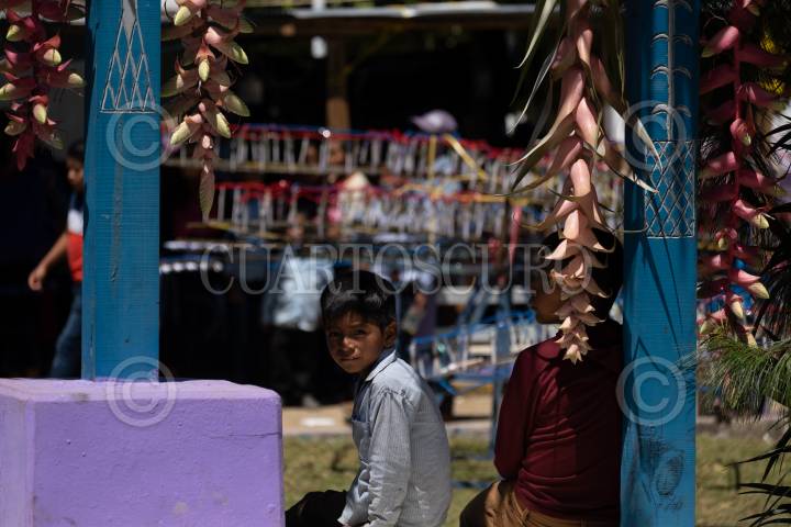 Un niño observa la instalación de fuegos pirotécnicos en la cabecera municipal.