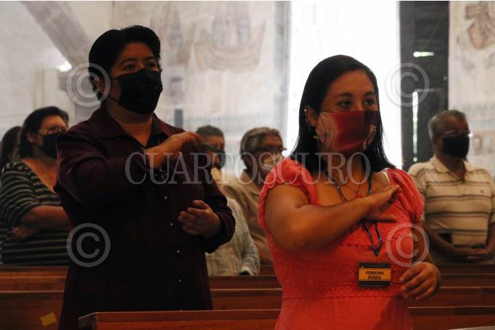 Dos mujeres sordas participan en un canto religioso con lenguaje de señas, durante la homilía dominical en la catedral de Cuernavaca.