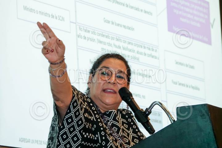 CIUDAD DE MÉXICO, 20NOVIEMBRE2024.- La ministras de la Suprema Corte de Justicia de la Nación (SCJN), Lenia Batres, durante la mesa de diálogo “Ventajas de la Reforma Judicial” con invitados e integrantes del Harvard Club México en el Piso 51 de la Torre Mayor. FOTO: GALO CAÑAS/CUARTOSCURO.COM