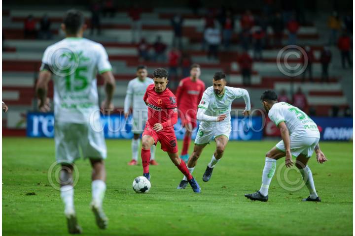 Leo Fernández medio de los Diablos de Toluca y Emanuel Gularte defensa de la Franja de Puebla durante el encuentro ante en el estadio Nemesio Diez.