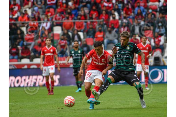 Leo Fernández medio de los Diablos de Toluca Fernando Gorriarán medio de Santos Laguna durante el encuentro de la jornada 4 del Tornero Apertura 2022 con un marcador final 2-1.