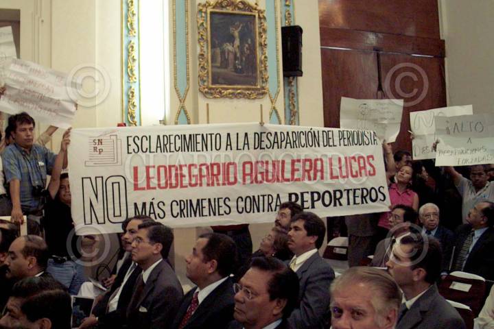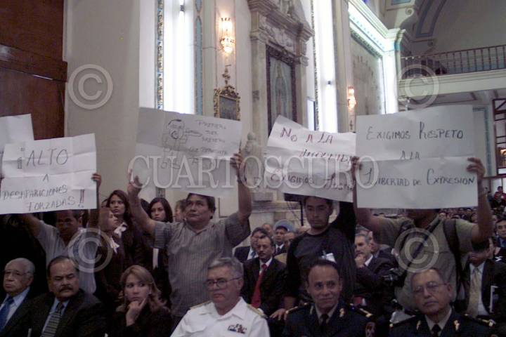 Chilpancingo, Guerrero, 13SEPTIEMBRE2004.- Periodistas del estado de Guerrero protestaron durante la ceremonia del 191 aniversario de la Instalacion del Primer Congreso de Anahuac en Chilpancingo. Exigieron el esclarecimiento de la desaparicion del periodista y editor de la revista Mundo Politico Leodegario Aguilera Lucas. Foto: Oscar Alvarado/CUARTOSCURO.COM