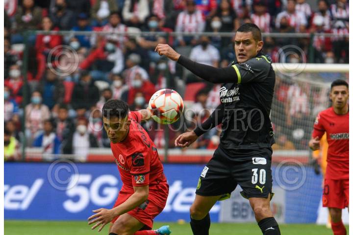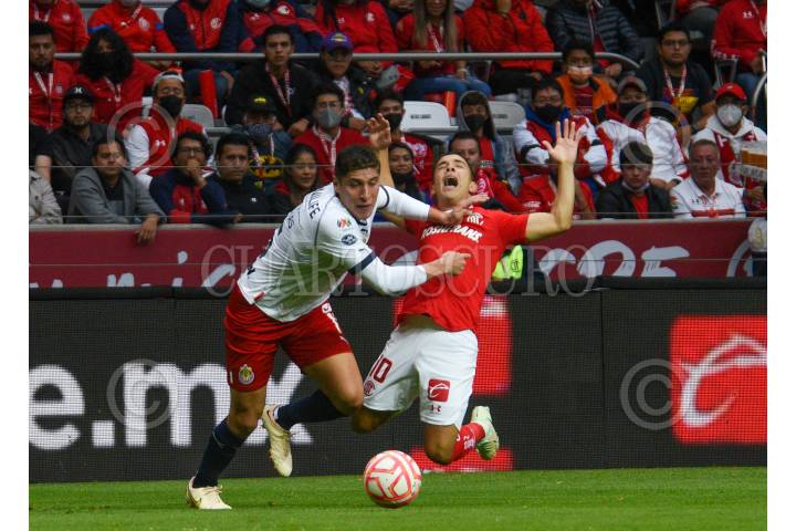 Luis Olivas defensa de Chivas de Guadalajara y Leonardo Fernández medio de los Diablos de Toluca pelean el esférico durante el encuentro de la jornada 12 del Torneo Apertura 2022.