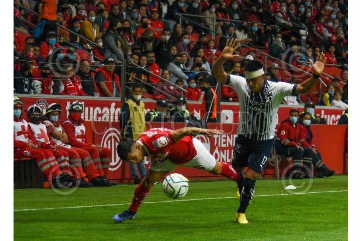 Leonardo Fernández medio de los Diablos de Toluca pelea el esférico con Jesús Gallardo defensa de Monterrey durante el encuentro en el estadio Nemesio Diez.