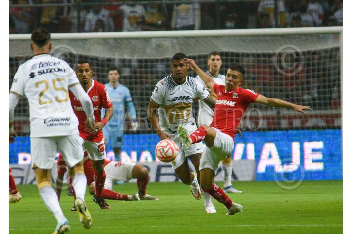 Leonardo Fernández medio de los Diablos de Toluca disputa el balón ante jugadores de Pumas de la UNAM.