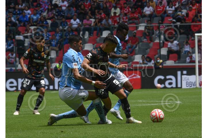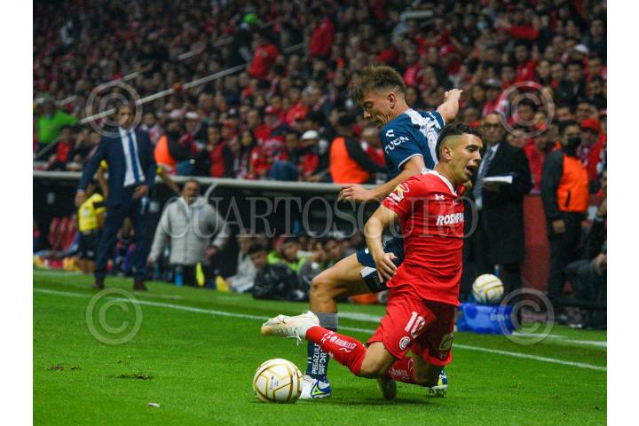 Leonardo Fernández medio de los Diablos de Toluca disputa el balón durante el encuentro ante Tuzos de Pachuca en el juego de ida de la Final del Torneo Apertura 2022.