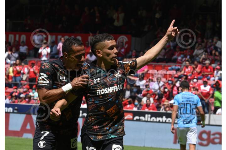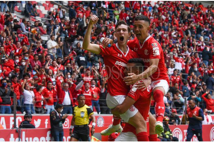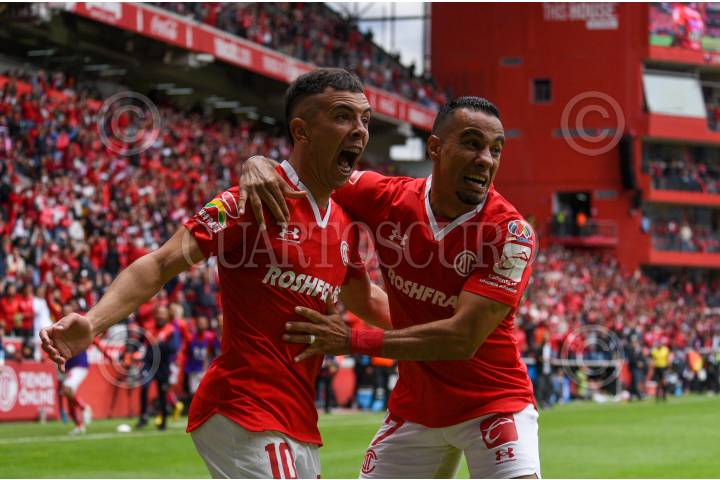 Leonardo Fernández medio de los Diablos de Toluca festeja su anotación ante los Rayados del Necaxa en el estadio Nemesio Diez.