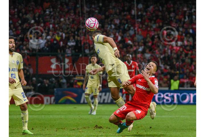 Leonardo Fernández medio de los Diablos de Toluca pelea el esférico durante el encuentro ante las Águilas del América en la jornada 2 del Torneo Clausura 2023.