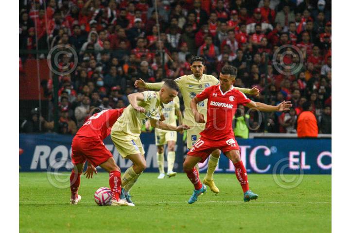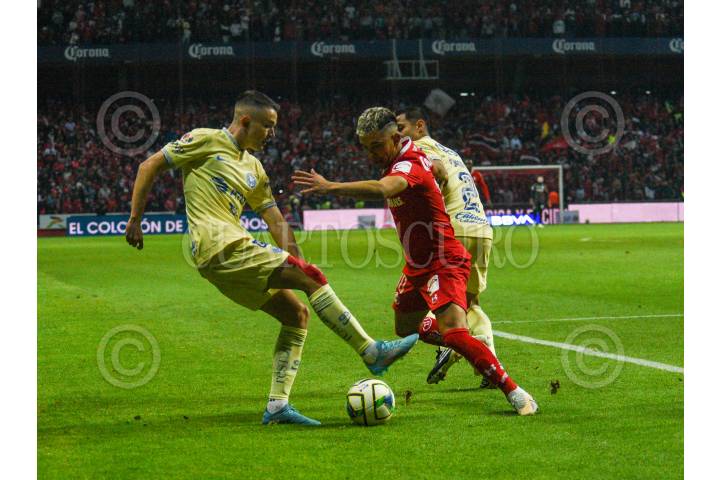 Leonardo Fernández medio de los Diablos de Toluca durante el encuentro ante las Águilas del América en el estadio Nemesio Diez.