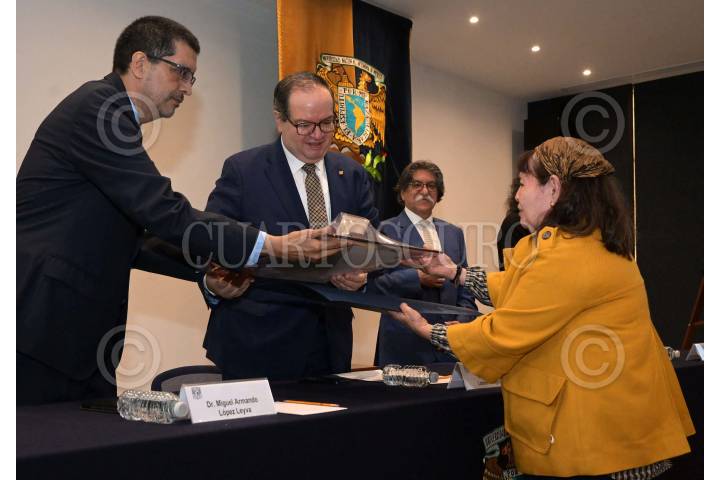 CIUDAD DE MÉXICO, 12MAYO2025.- El rector Leonardo Lomelí Vanegas anunció que la UNAM realizará un esfuerzo extraordinario para reasignar recursos a un programa complementario de apoyo alimentario, pese a que el presupuesto de esta casa de estudios sufrió una reducción en términos reales este 2025. El anuncio lo efectuó al entregar la Cuenta Anual 2024 al auditor Superior de la Federación, David Colmenares Páramo, y al presidente de la Comisión de Vigilancia de la Auditoría Superior de la Federación, Javier Octavio Herrera Borunda, ante quienes aseveró que rendir cuentas no es un trámite administrativo, sino un acto de transparencia y parte de la esencia de la labor que nuestra gran Universidad asume con la sociedad a la que se debe. FOTO: UNAM/CUARTOSCURO.COM