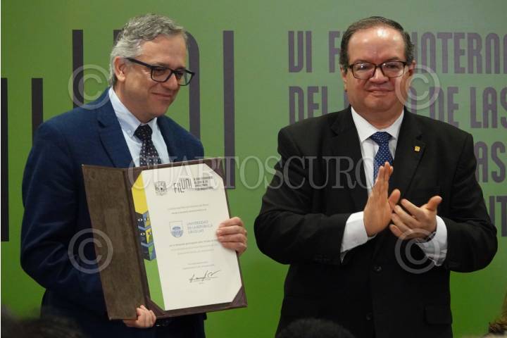 CIUDAD DE MÉXICO, 27AGOSTO2024.-Leonardo Lomelí Vanegas, rector de la Universidad Nacional Autónoma de México (UNAM), entregó un Reconocimiento por su participación a Rodrigo Arim, rector de la Universidad de la República de Uruguay (UDELAR), durante la inauguración de la VI Feria Internacional del Libro de las Universitarias y los Universitarios realizada en el Centro de Exposiciones y Congresos UNAM. FOTO: GRACIELA LÓPEZ /CUARTOSCURO.COM