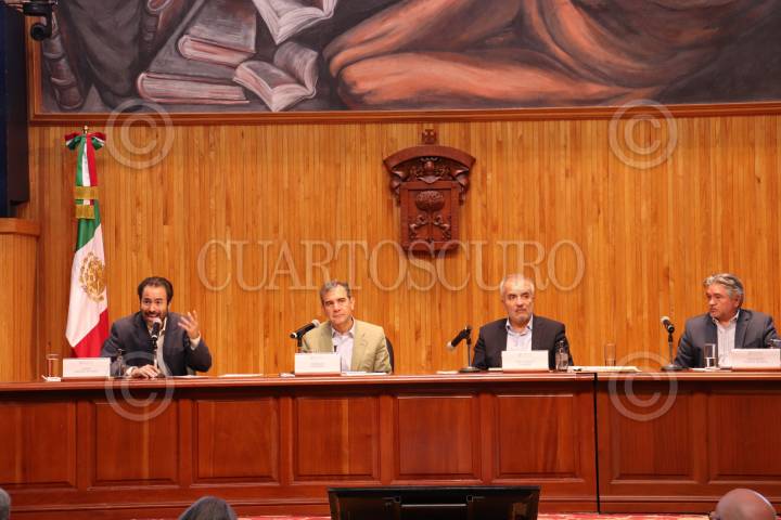 David González Álvarez, Lorenzo Córdova Vianello, Luis Carlos Ugalde, y Leonardo Valdés Zurita, durante el Foro Internacional: En defensa del INE y de la democracia mexicana.