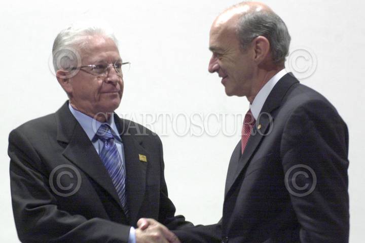 México, D.F., 07JUNIO2004.- Raúl Muñoz Leos, director de PEMEX, saluda a el recien nombrado secretario de energía, Fernando Elizondo, después de presentar su informe de labores del año 2003 al frente de los rumbos de petroleos de México. FOTO: Moisés Pablo/CUARTOSCURO.COM