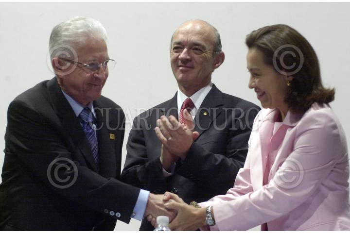 México, D.F., 07JUNIO2004.- Raúl Muñoz Leos, director de PEMEX, Fernando Elizondo, secretario de energía y Josefina Vázquez Mota, secretaría de desarrollo, durante la presentación de informe de actividades corespondiente al 2003 de las actividades de petroleos de México. FOTO: Moisés Pablo/CUARTOSCURO.COM