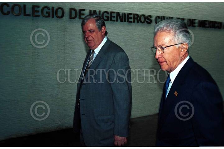 Raúl Muñoz Leos, director de PEMEX, es acompañado por Manuel Gómez Rangel, en el colegio de Ingenieros Civiles de México. Donde se realizó el IV foro ¨Pemex: Inversiones para impulsar el crecimiento¨. FOTO: Moisés Pablo/CUARTOSCURO.COM
