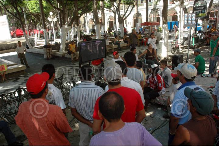 VERACRUZ, VERACRUZ. 11JUNIO2010.- Aficionados porteños disfrutando del partido de la selección mexicana en el inicio de la copa del mundo Sudáfrica 2010, en los tradicionales portales de Lerdo. FOTO: JOSÉ CANDELARIO/CUARTOSCURO.COM