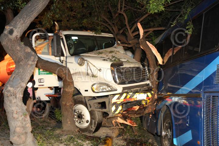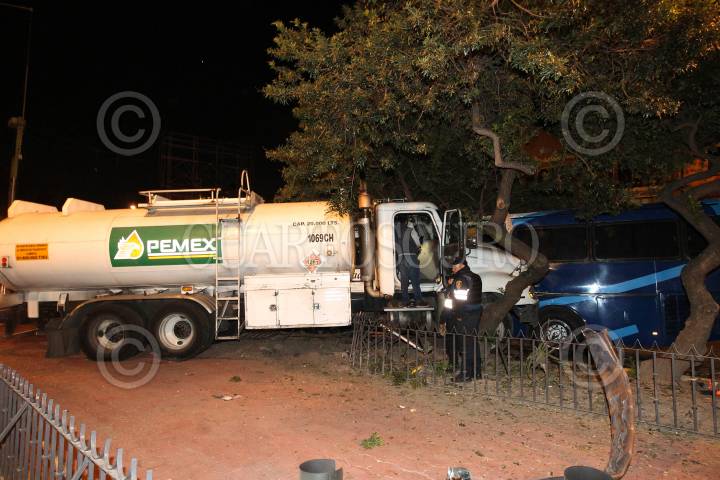 CIUDAD DE MÉXICO., 10ENERO2018.- Una pipa de PEMEX que era conducida por una joven, se impactó contra un árbol y un autobús que se encontraba estacionado, sobre eje 10 a la altura de la calle Contlalco en la colonia Pedregal De Santo Domingo en Coyoacán. La mujer fue trasladada a un hospital cercano con lesiones leves. FOTO: LUIS CARBAYO /CUARTOSCURO.COM
