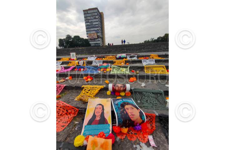 CIUDAD DE MÉXICO, 02NOVIEMBRE2023.- Fue instalada una ofrenda dedicada a víctimas de acto violencia y que estaban vinculadas a la UNAM, muy cerca de rectoría. En la instalación se aprecia imágenes de: Aideé Mendoza Jerónimo quien murió por una bala pérdida cuando tomaba clases en el CCH Oriente y de Lesvy Berlín quien murió asesinada por su novio en el campus universitario de Ciudad Universitaria. FOTO: MOISÉS PABLO/CUARTOSCURO.COM