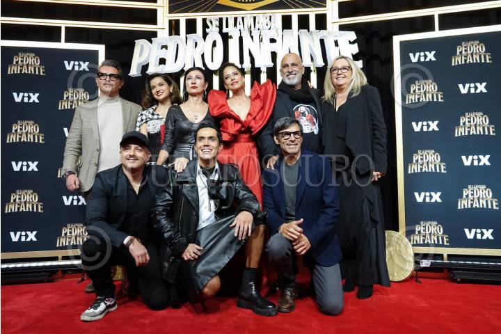 CIUDAD DE MÉXICO, 27NOVIEMBRE2023.- Los acotores Vico Escorcia, Leticia Huijara, Ana Claudia Talancón, Mario Moran y Julio Bracho acompañados del director Sergio Siruela y el productor Rubén Galindo durante la Alfombra roja de la bioserie "Se llamaba Pedro Infante" realizada en Estudios Churubusco. FOTO: GRACIELA LÓPEZ /CUARTOSCURO.COM