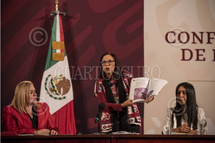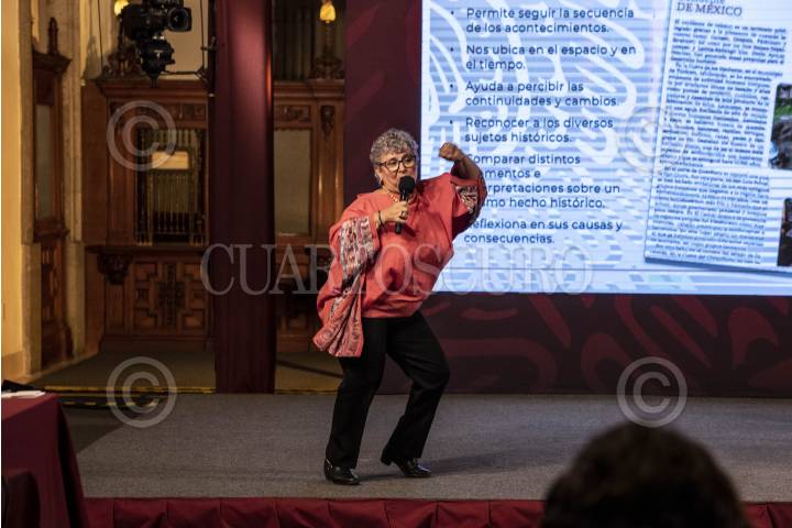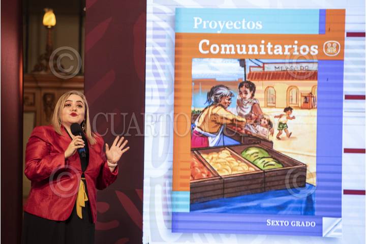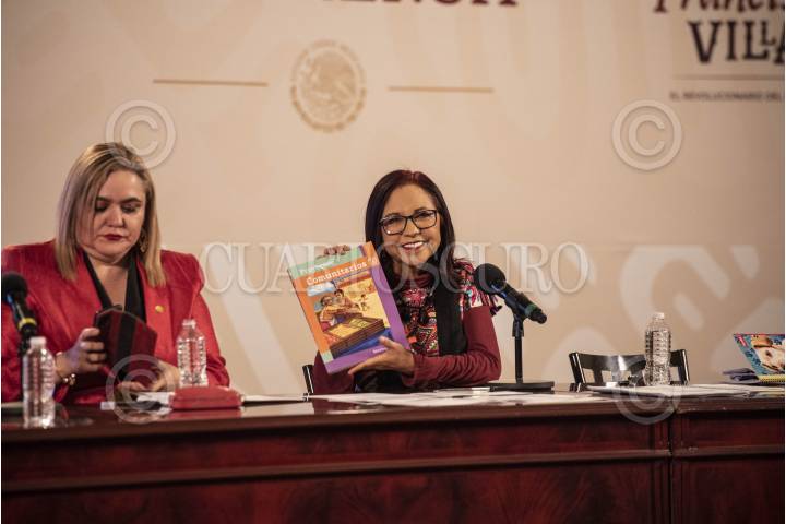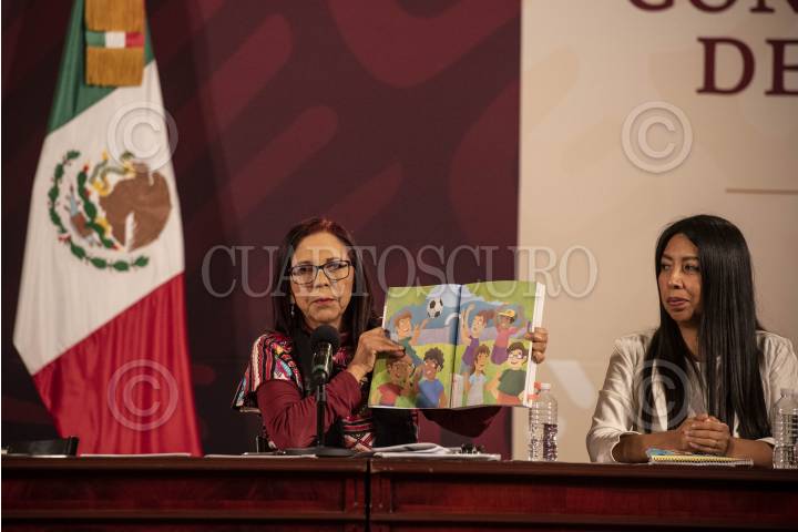 Conferencia de prensa en donde se presentaron algunas de las secciones y contenido de los nuevos libros de texto de la Secretaría de Educación Pública. En la conferencia estuvieron presentes Leticia Ramírez Amaya, secretaria de Educación Pública, Ana María Prieto Hernández, maestra normalista de Educación Primaria, Adriana Yolanda Domínguez Cornejo, docente formadora de maestras y maestros de la Escuela Normal de Educación Física del Estado de México, y las docentes Isabel Camargo Cesáreo e Irma Vázquez Guerrero.