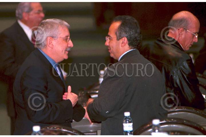 Oscar Levin Coppel y Felipe Calderón, esta tarde, durante la sesión en el interior de la Cámara de Diputados, mientras a las afueras un grupo de campesinos irrumpian a las inmediaciones de San Lázaro en demanda de más presupuesto para el campo mexicano. FOTO: Oswaldo Ramírez/CUARTOSCURO.COM
