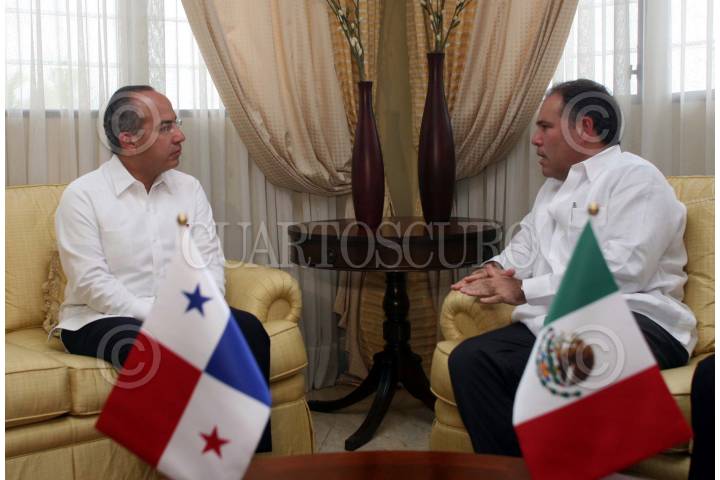PANAMÁ, PANAMÁ 05MARZO2008.- El Presidente de la República, Felipe Calderon Hinojosa junto con el Vicepresidente y Mistro de Relaciones Exteriores de Panamá Samuel Lewis en la capital panameña. FOTO: ALFREDO GUERRERO/CUARTOSCURO.COM