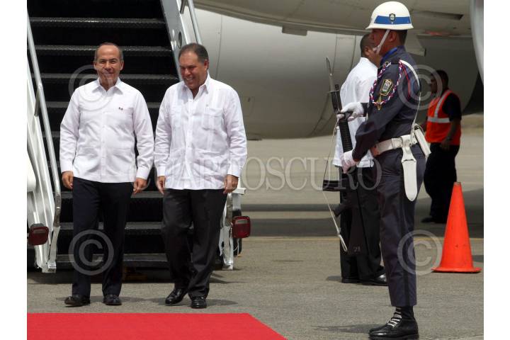PANAMÁ, PANAMÁ 05MARZO2008.- El presidente de la república, Felipe Calderon Hinojosa a su llegada a la ciudad de Panama, acompañado por Samuel Lewis, primer Vicepresidente y Ministro de Relaciones Exteriores de Panamá. FOTO:ALFREDO GUERRERO/CUARTOSCURO.COM