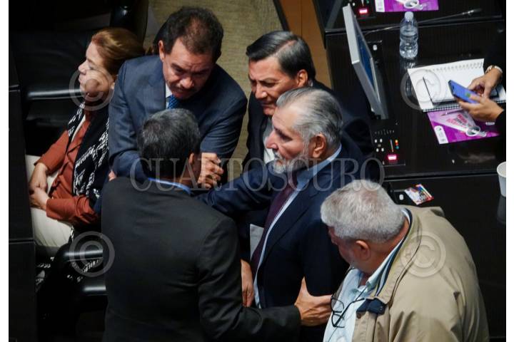CIUDAD DE MÉXICO, 24JUNIO2025.- Los senadores morenistas Ignacio Mier; Óscar Cantón Zetina; Javier Corral (espalda) Adán Augusto López, (coordinador) y Manuel Huerta Ladrón de Guevara durante la sesión de la Cámara de Senadores en la que se discutió la Ley Nacional para eliminar trámites burocráticos. FOTO: GALO CAÑAS/CUARTOSCURO.COM