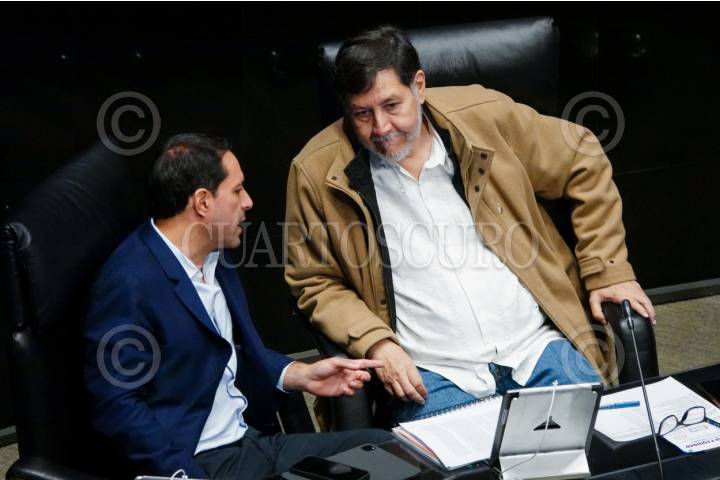 CIUDAD DE MÉXICO, 24JUNIO2025.- Mauricio Vila, senador panista, conversa con Gerardo Fernández Noroña, presidente de la Mesa Directiva del Senado, durante la sesión de la Cámara de Senadores en la que se discutió la Ley Nacional para eliminar trámites burocráticos. FOTO: GALO CAÑAS/CUARTOSCURO.COM
