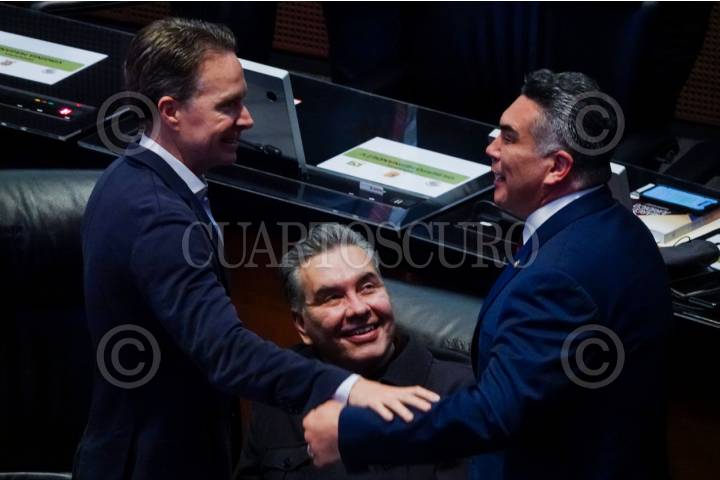 CIUDAD DE MÉXICO, 24JUNIO2025.- Manuel Velasco Coello, coordinador de la bancada del PVEM, el senador del Partido Verde, Waldo Fernández González, y Alejandro Moreno Cárdenas, coordinador priista, durante la sesión de la Cámara de Senadores en la que se discutió la Ley Nacional para eliminar trámites burocráticos. FOTO: GALO CAÑAS/CUARTOSCURO.COM