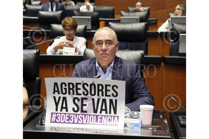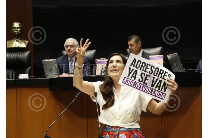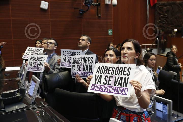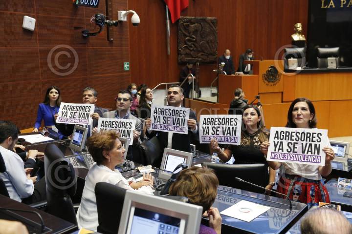 La Comisión Permanente hizo la declaratoria constitucional de la Ley 3 de 3, que prohíbe otorgar cargos públicos a deudores alimentarios u agresores sexuales. En la imagen senadores con pancartas con la leyenda "Agresores ya se van",