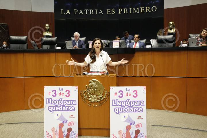 La Comisión Permanente hizo la declaratoria constitucional de la Ley 3 de 3, que prohíbe otorgar cargos públicos a deudores alimentarios u agresores sexuales. En la imagen la senadora Kenia López Rabadán.