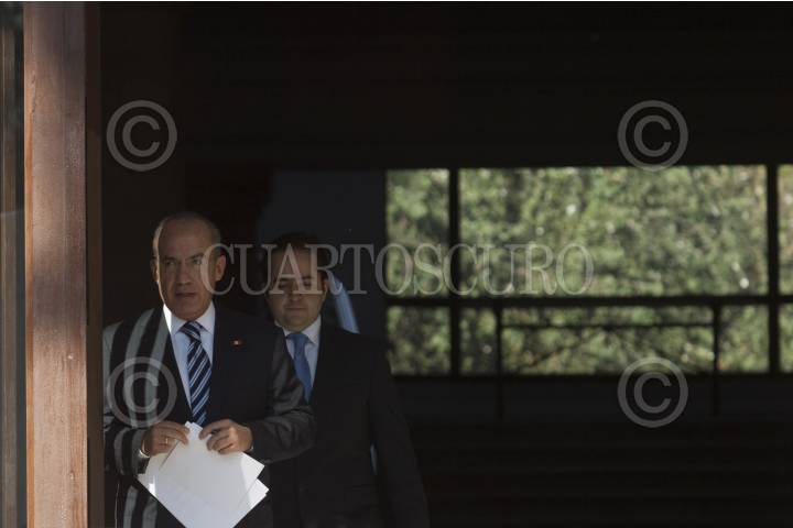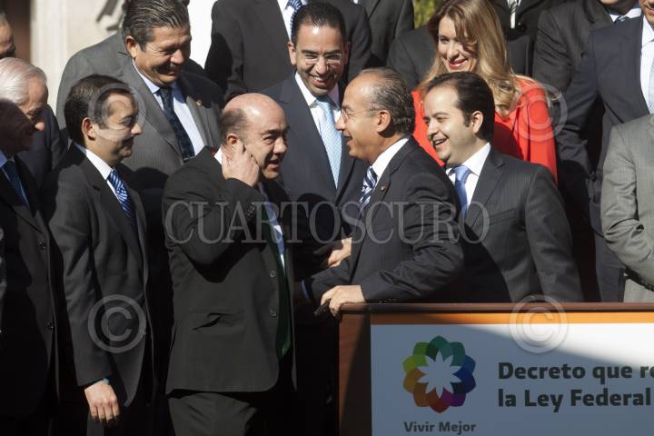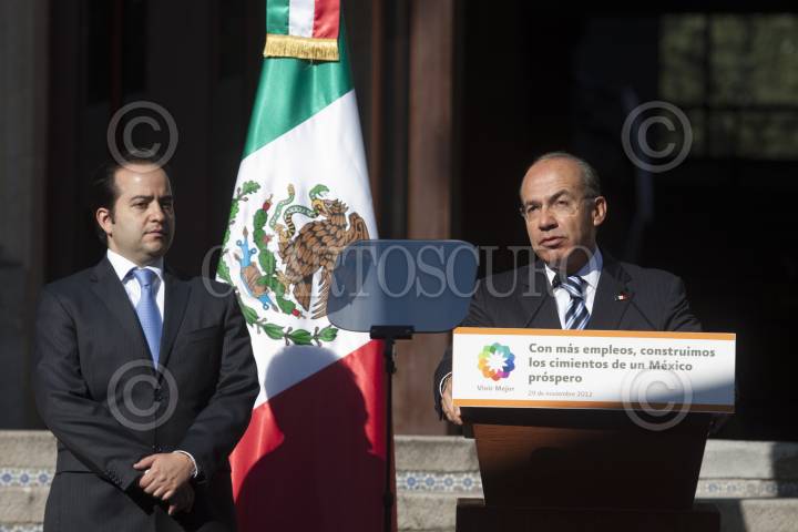 MÉXICO, D.F., 29NOVIEMBRE2012.- Alejandro Poiré, secretario de Gobernación, y Felipe Calderón Hinojosa, Presidente de México, en la firma del decreto que reforma la Ley Federal del Trabajo en la residencia oficial de Los Pinos. FOTO: MOISÉS PABLO /CUARTOSCURO.COM