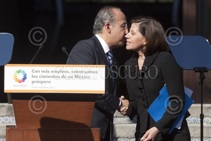 MÉXICO, D.F., 29NOVIEMBRE2012.- Felipe Calderón Hinojosa, Presidente de México, y Rosalinda Velez Juárez, secretaria del Trabajo y Previsión Social, tras la firma del decreto que reforma la Ley Federal del Trabajo en la residencia oficial de Los Pinos. FOTO: MOISÉS PABLO /CUARTOSCURO.COM