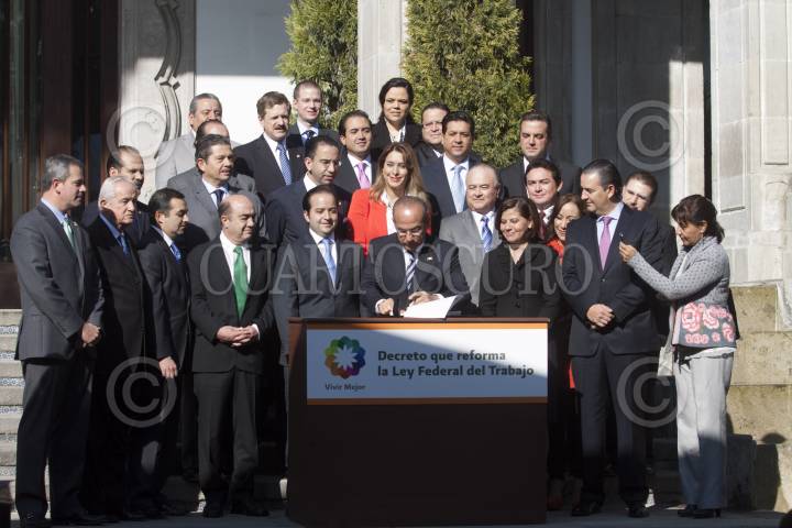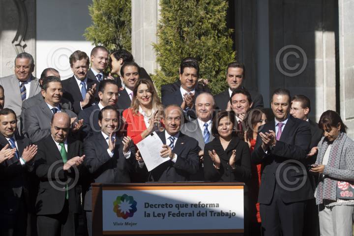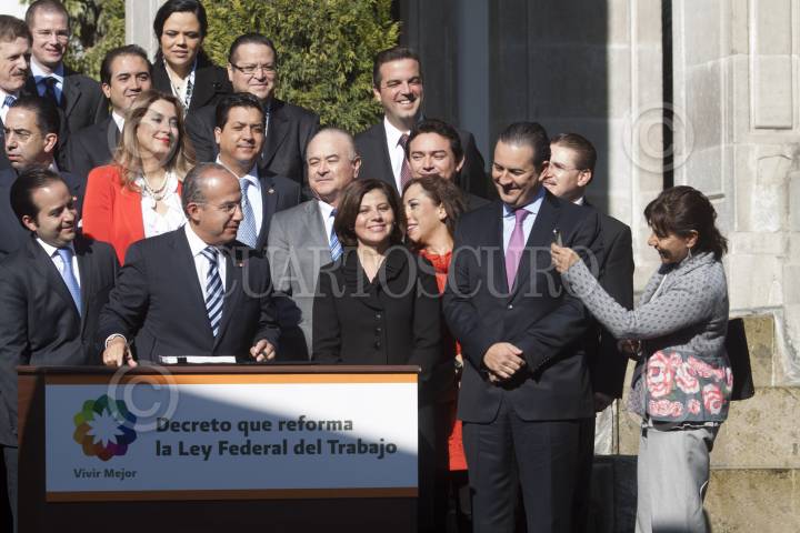 MÉXICO, D.F., 29NOVIEMBRE2012.- Felipe Calderón Hinojosa, Presidente de México, firmó el decreto que reforma la Ley Federal del Trabajo en la residencia oficial de Los Pinos. En la primera fila de la imagen Ernesto Cordero, presidente de la mesa directiva del Senado, Jesús Murillo Karam, presidente de la Cámara de Diputados, Alejandro Poiré, secretario de Gobernación, Rosalinda Velez Juárez, secretaria del Trabajo y Previsión Social, Gerardo Gutiérrez Candiani, presidente del Consejo Coordinador Empresarial, y Luisa María Calderón, senadora del PAN. FOTO: MOISÉS PABLO /CUARTOSCURO.COM