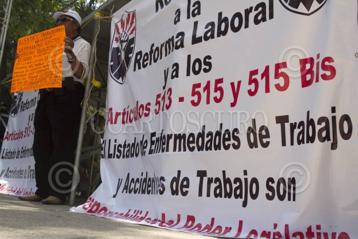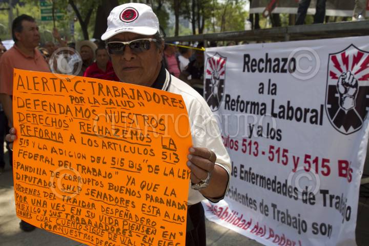 CIUDAD DE MÉXICO, 23MARZO2017.- Integrantes de diversos sindicatos se manifestaron afuera del Senado, para rechazar la reforma que modifica los artículos 513, 515 y el 515 Bis de la Ley Federal del Trabajo, que contempla una reducción del 50% del pago del salario de los trabajadores cuando se enferme por causas laborales. FOTO: MOISÉS PABLO /CUARTOSCURO.COM