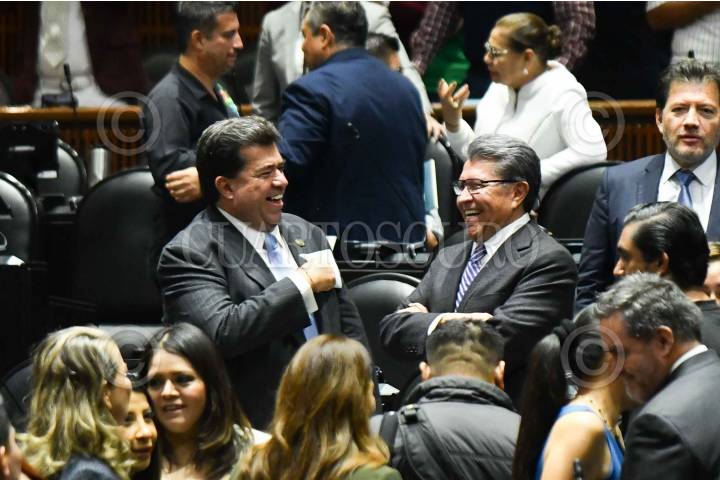 CIUDAD DE MÉXICO, 02OCTUBRE2024.- Pedro Haces, y Ricardo Monreal, diputados de Morena, durante la sesión ordinaria semipresencial de la Cámara de Diputados en la que se aprobó el proyecto de decreto por el que reforma y adiciona diversas disposiciones de la Ley Federal del Trabajo, en materia del derecho al descanso de las personas trabajadoras durante la jornada laboral, conocida como la "ley silla". FOTO: MARIO JASSO/CUARTOSCURO.COM