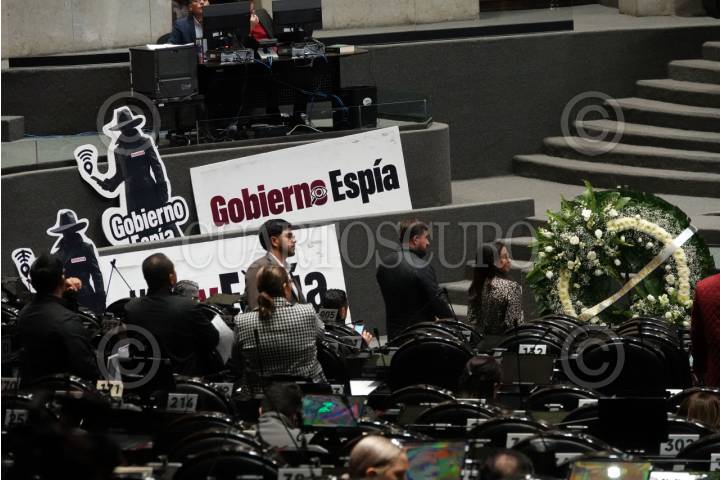 CIUDAD DE MÉXICO, 25JUNIO2025.- Un cartel con la leyenda “Gobierno Espía” así como una corona de flores se observa durante la sesión del periodo Extraordinario en que se discute la Ley de Seguridad Pública.