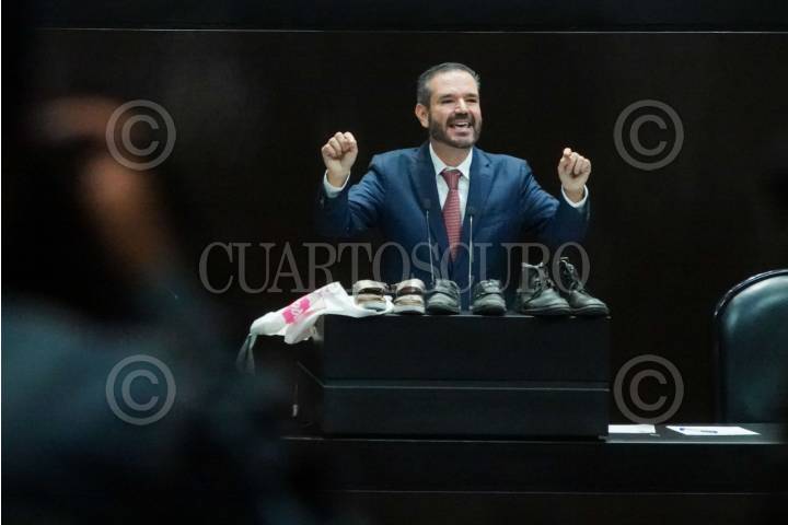 CIUDAD DE MÉXICO, 25JUNIO2025.- El diputado panista Miguel Ángel Monraz muestra zapatos en alusión al caso Teuchitlán durante el uso de la tribuna durante la sesión del periodo Extraordinario en la Cámara de Diputados en que se discute la Ley de Seguridad Pública.