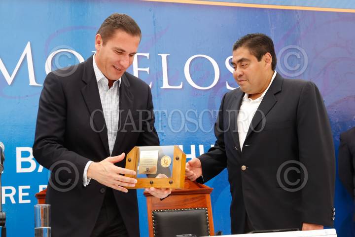 TEHUACÁN, PUEBLA, 30SEPTIEMBRE2013.- El Cabildo de Tehuacán, Puebla le otorgó el reconocimiento ¨Moneda Conmemorativa¨ con motivo de los dos centenarios de Morelos en Tehuacán al senador Miguel Barbosa Huerta. La medalla fue entregada por Rafael Moreno Valle, gobernador de Puebla y Eliseo Lezama Prieto, alcalde de Tehuacán. FOTO: CUARTOSCURO.COM