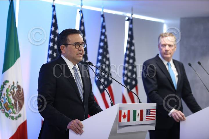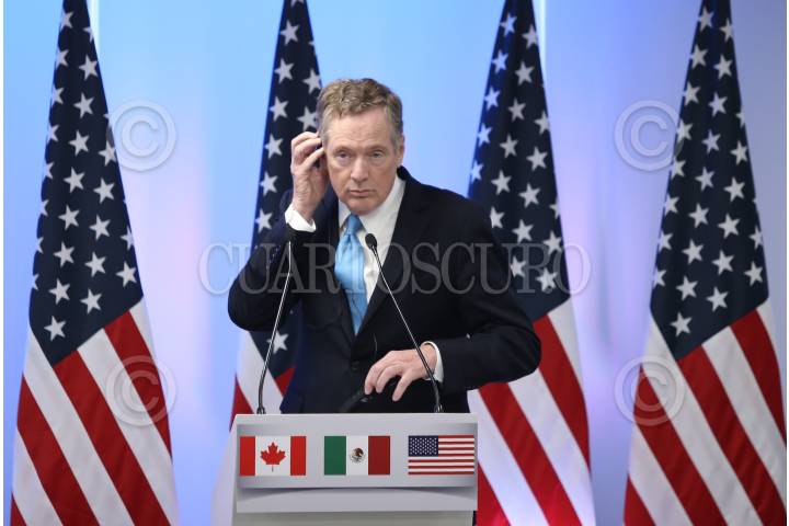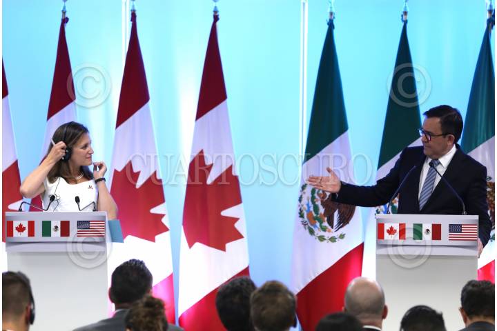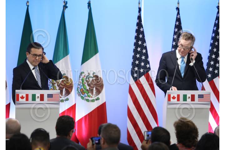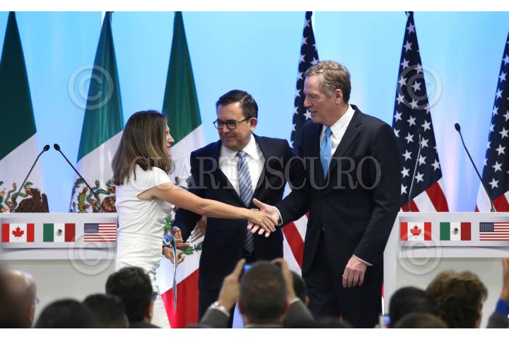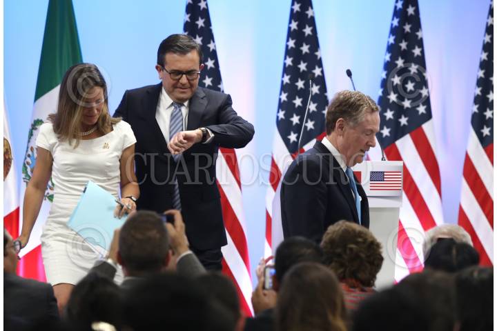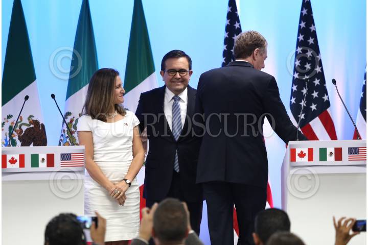 CIUDAD DE MÉXICO, 05SEPTIEMBRE2017.- Chrystia Freeland, Canciller de Canadá, Ildefonso Guajardo, secretario de Economía de México y Robert Lighthizer, representante de Comercio Exterior de los Estados Unidos, durante la conferencia de cierre de la "Segunda Ronda Negociaciones para la Modernización del Tratado de Libre Comercio de América del Norte". FOTO: ADOLFO VLADIMIR /CUARTOSCURO.COM