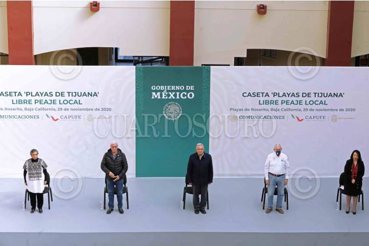 Elsa Julita Veites Arévalo, Jaime Bonilla Valdez, Andrés Manuel López Obrador, Jorge Arganis Díaz Leal, y Hilda Araceli Brown Figueredo, durante evento Caseta "Playas de Tijuana", Libre Peaje Local.
