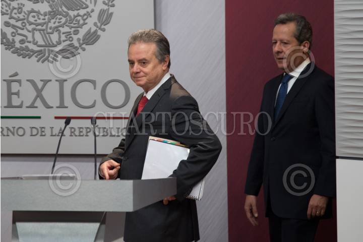 CIUDAD DE MÉXICO, 08FEBRERO2018.- Joaquín Coldwell, secretario de Energía, y Eduardo Sánchez Hernández, coordinador general de Comunicación Social y Vocero del Gobierno de la República, durante conferencia de prensa informaron que las nuevas licitaciones petroleras realizadas por la reforma energética, permitirán generar una cantidad de 230 mil nuevos empleos en los próximos 15 años. FOTO: MARIO JASSO /CUARTOSCURO.COM