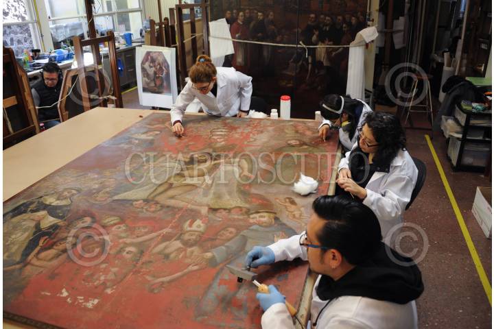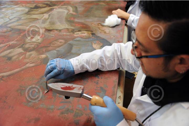 CIUDAD DE MÉXICO, 13DICIEMBRE2018.- Expertos unen lienzo del siglo XVIII fragmentado por el sismo del 19 de septiembre. se encuentran ahora restaurándolo. FOTO: INAH / CUARTOSCURO.COM