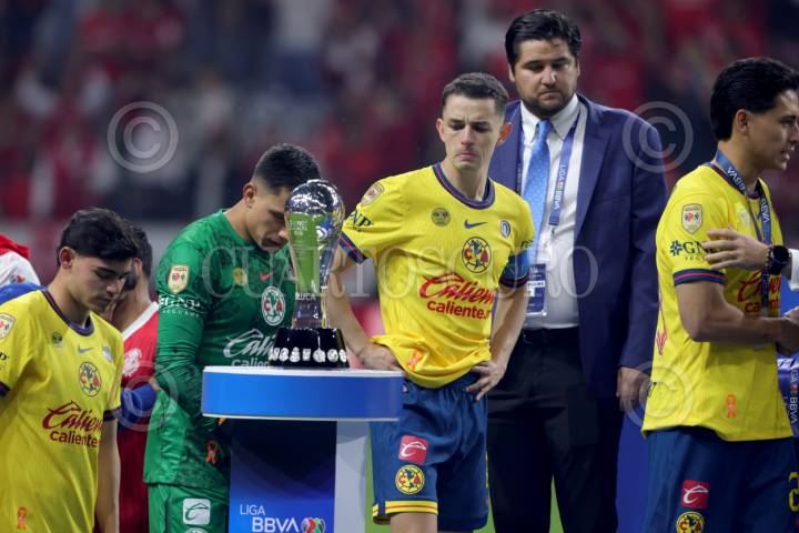 TOLUCA, ESTADO DE MÉXICO, 25MAYO2025. Álvaro Fidalgo mira el trofeo de campeón tras caer ante Toluca quien se coronó campeón del Torneo Clausura 2025 de Liga BBVA MX, en el Estadio Nemesio Díez. FOTO: EDGAR NEGRETE LIRA/CUARTOSCURO.COM