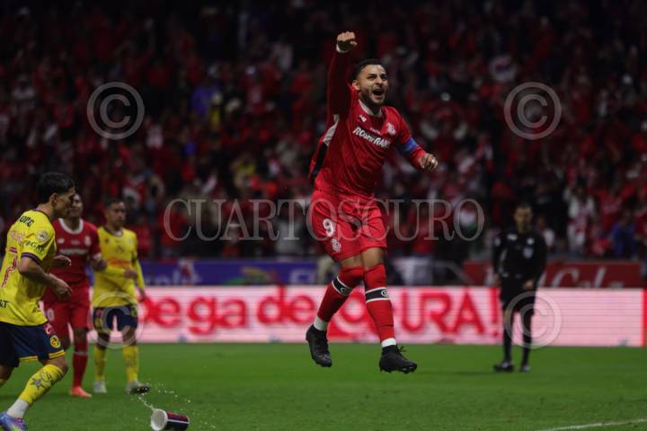 TOLUCA, ESTADO DE MÉXICO, 25MAYO2025. Festejo de Alexis Vega tras conseguir su anotación durante el partido de fútbol Toluca vs América correspondiente a la final de vuelta del Torneo Clausura 2025 de Liga BBVA MX, en el Estadio Nemesio Díez. FOTO: EDGAR NEGRETE LIRA/CUARTOSCURO.COM