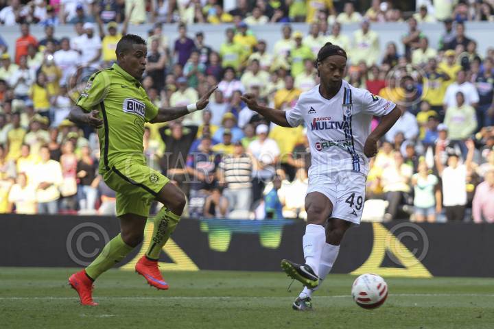 MÉXICO, D.F., 18ABRIL2015.- Los Gallos Blancos del Querétaro golearon a las Águilas del América por cuatro goles por cero en su visita al Estadio Azteca en la jornada 14 del Torneo del Fútbol Mexicano Clausura 2015. Rodaldinho, entró los 10 minutos finales y anotó los dos últimos goles. FOTO: ADOLFO VLADIMIR /CUARTOSCURO.COM