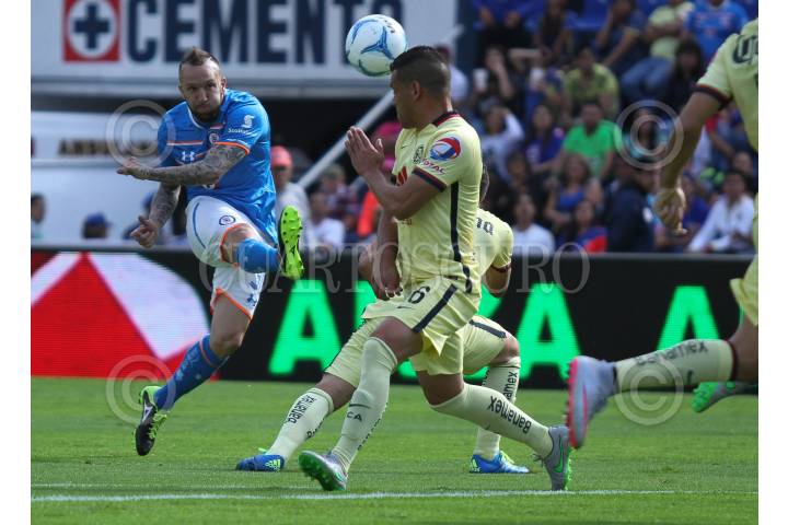 MÉXICO, D.F., 29AGOSTO2015.- En partido de la jornada 7 de la Liga MX Apertura 2015, Matias Buoso dispara al arco durante el encuentro que la máquina celeste del Cruz Azul pierde en casa dos goles por cero frente a las Águilas del América. FOTO: ADOLFO VLADIMIR /CUARTOSCURO.COM