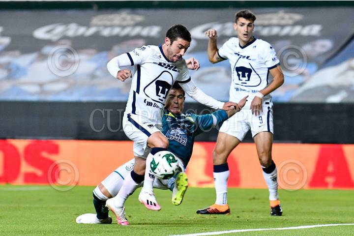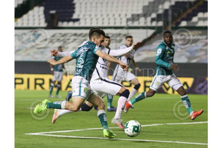 Juan Pablo Vigón (Pumas) durante una acción en el área chica de León, durante la final del Torneo Guard1anes de la Liga MX.
