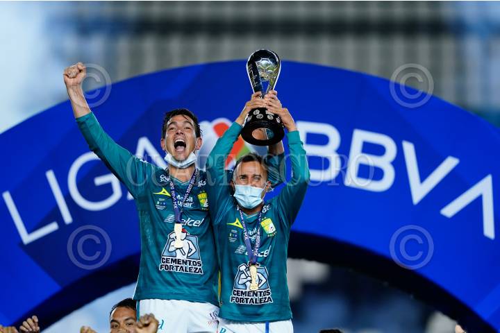 El equipo de León durante su festejo después de derrotar 2-0 a los Pumas en la final del torneo Guard1anes 2020 de la Liga BBVA MX, disputado en el Estadio León. Los jugadores Ignacio González y Luis Montes levantan la octava copa en la historia de los esmeraldas.